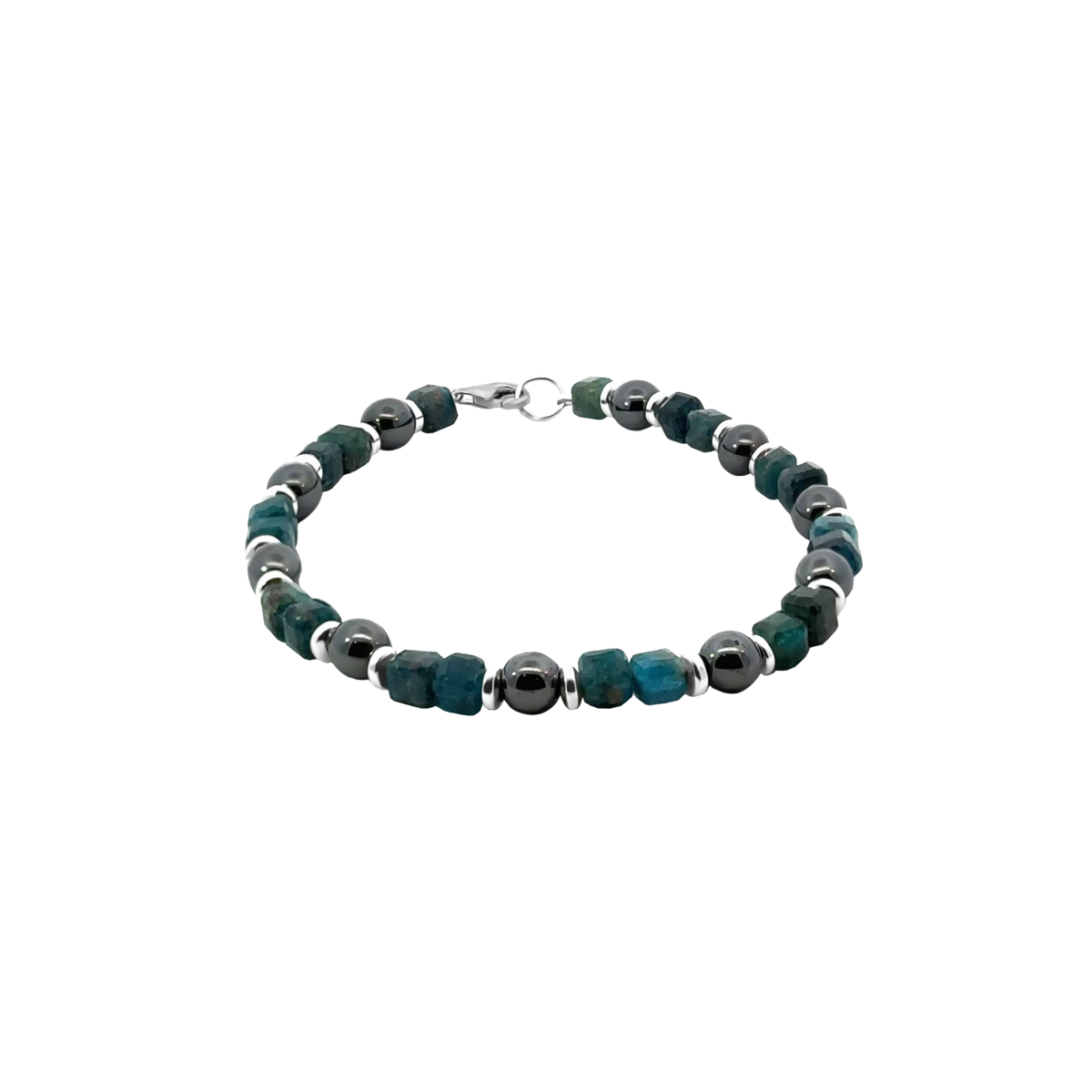 Ez a férfiaknak tervezett karkötő különleges apatit és hematit ásványokból készült, kiegészítve elegáns ezüst színű hematit elemekkel. A karkötő modern, férfias és lendületes – tökéletes választás mindennapi viselethez vagy különleges alkalmakra. Az apatit ismert inspiráló és energizáló hatásáról, támogatja az önkifejezést, serkenti a kreativitást, erősíti az önbizalmat és segít a célok elérésében. A hematit földelő hatású, elősegíti a belső stabilitást, növeli a koncentrációt és fokozza a magabiztosságot. Ez a karkötő nemcsak stílusos kiegészítő, hanem a belső erő, harmónia és férfias magabiztosság szimbóluma is.