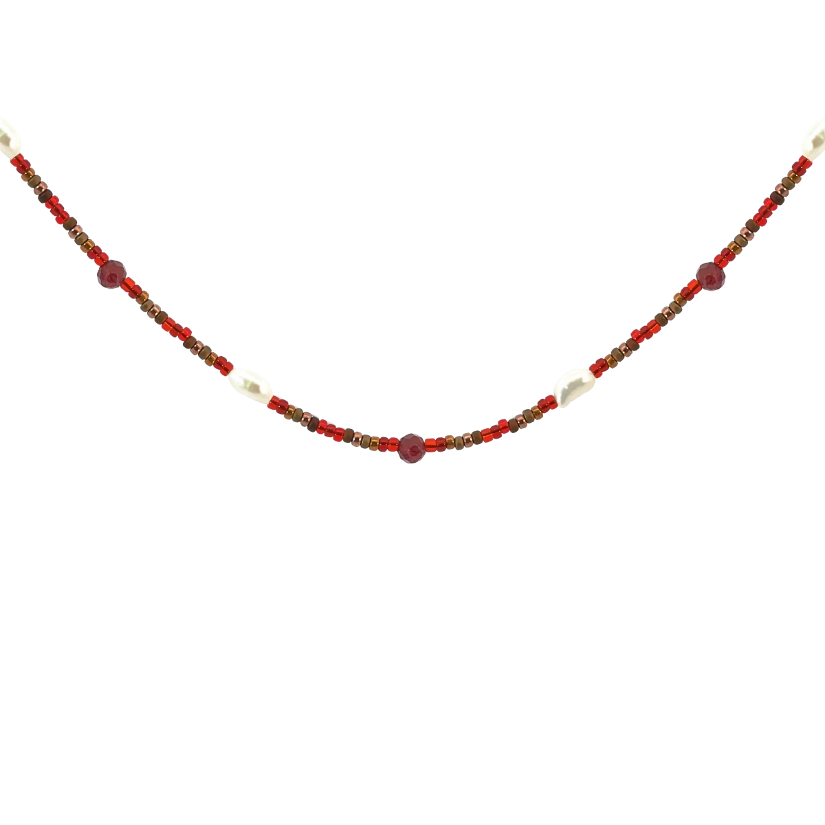 Ez a kézzel készült nyaklánc a nőies elegancia és a modern, ünnepi hangulat találkozása. A ragyogó, pirosas–bordós kásagyöngyök azonnal magukra vonzzák a tekintetet, meleg tónusuk pedig tökéletesen harmóniába kerül a mély vörös színű gránát ásvánnyal. A gránátot sokan az erő, a szenvedély és a védelem kövének tartják, így nemcsak látványos, hanem energiát és önbizalmat sugárzó ékszer is. A nyakláncban finoman megjelenő fehér rizsszem gyöngyök friss, letisztult kontrasztot teremtenek a bordó árnyalatok mellé, kiemelve az ékszer eleganciáját és nőiességét. A praktikus lánchosszabbítónak köszönhetően könnyedén állítható méretre, így kényelmes viselet a mindennapokban, de különösen ideális választás ünnepi alkalmakra, téli szezonra vagy akár különleges ajándékként.