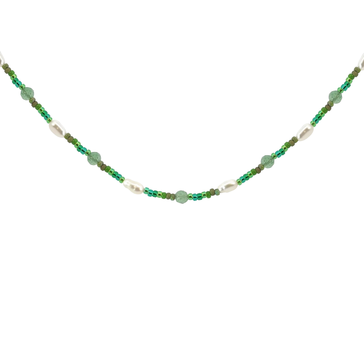 Ez a nyaklánc ünnepi ragyogást sugároz a domináns zöld design gyöngyöknek és a csillogó zöld aventurinnak köszönhetően, amelyek friss, mégis kifinomult megjelenést biztosítanak. Az aventurint sokan a harmónia, a szerencse és a pozitív energiák kövének tartják, így különleges jelentéssel gazdagítja ezt az egyedi ékszert. A finom, fehér rizsszem gyöngyök gyönyörű kontrasztot alkotnak a zöld árnyalatokkal, még elegánsabbá téve a nyakláncot.