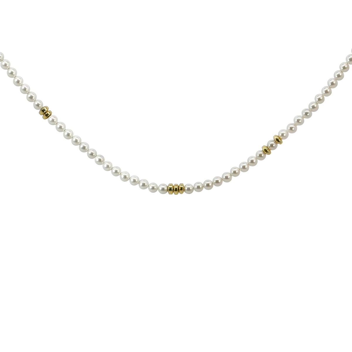 Ez a kézzel készült nyaklánc a klasszikus fehér gyöngyök kifinomult szépségét ötvözi az aranyszínű hematit fánk elemek modern csillogásával. A gyöngy az időtlen elegancia szimbóluma, finom fényével nőies, letisztult megjelenést biztosít, míg a hematit arany árnyalatai könnyed luxust adnak az ékszernek. A nyaklánc központi elemei – a fényesen ragyogó arany hematit fánk alakú elemek – gyönyörű kontrasztot alkotnak a hófehér gyöngyökkel, így tökéletes kiegészítő minden alkalomhoz: ünnepi eseményekhez, különleges alkalmakhoz vagy akár elegáns hétköznapi viselethez. A sárga aranyozott 925 sterling ezüst lánchosszabbító lehetővé teszi, hogy a nyaklánc mérete könnyedén és kényelmesen állítható legyen, így tökéletes illeszkedést biztosít minden nyakra.