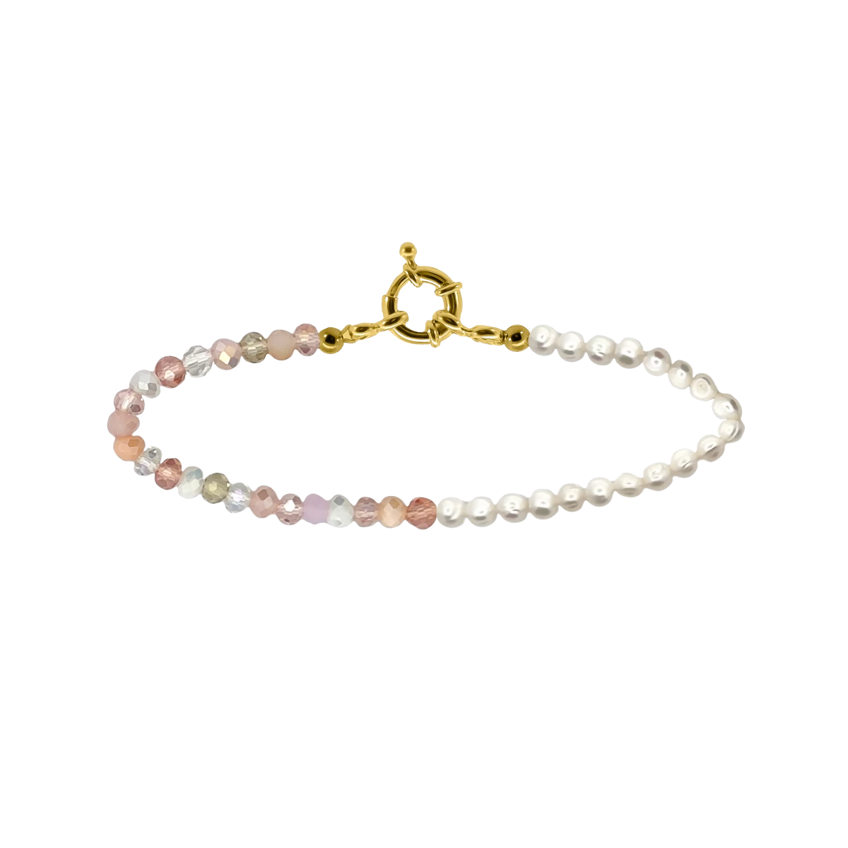 Egy lenyűgöző karkötő, amely a presztízs és a modern divat elegyedése, ahol a gyöngyök finomságát és a rózsaszín-fehér kristályok fényének játékát egy rendkívül különleges 18 karátos sárgaarannyal bevont 925 finomságú ezüst karabiner emeli a csúcsra.