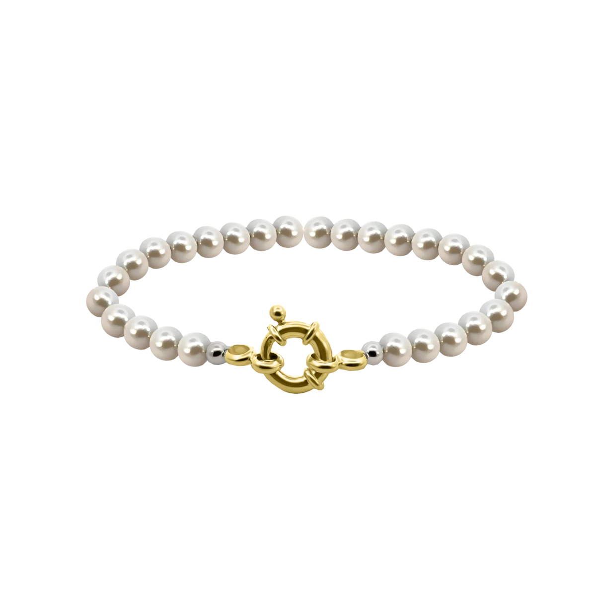 Egy karkötő, amely ötvözi a természetes szépséget és a modern dizájnt: a közepes méretű gyöngyök és a feltűnő, látványos, 18 karátos sárga arannyal bevont ezüst zár együtt tökéletes választás azok számára, akik szeretnének kitűnni a tömegből.