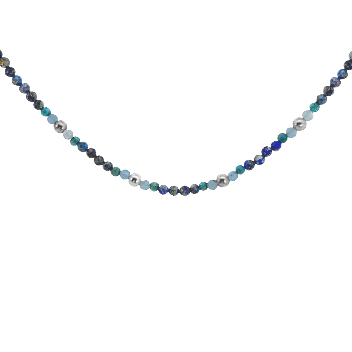 A lápisz lazuli ásványból készült nyaklánc, amelyet öt darab elegáns ezüst golyó díszít, nemcsak mutatós kiegészítő, hanem úgy tartják, hogy ez a különleges kő az önkifejezés útját is megnyitja viselője előtt, miközben manapság egyre nagyobb népszerűségnek örvendenek az ásvány ékszerek a spirituális és esztétikai előnyeik miatt.