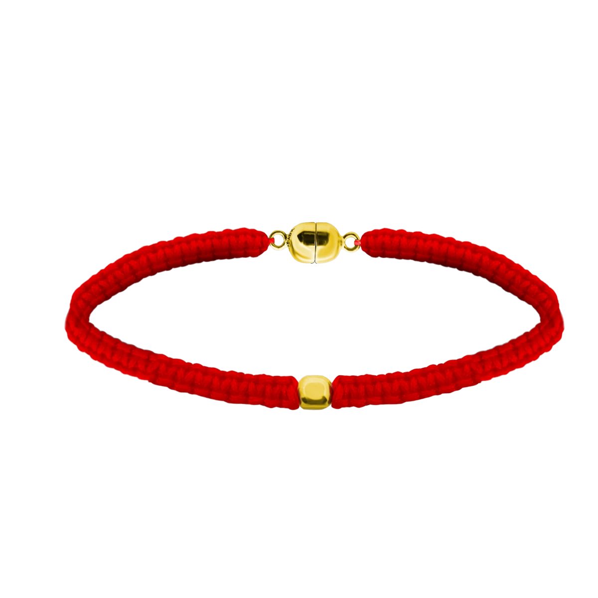 A makramé technikával, piros, szakadásmentes fonalból készített karkötőnk nem csak egy divatos kiegészítő, hanem egy mélyebb, spirituális jelentéssel is bíró darab, amelynek gyógyító- és védelmező erejét a piros szín biztosítja, míg a 18 karátos sárgaarannyal bevont ezüst 925 mágnes zár és a középen elhelyezkedő szintén aranyozott ezüst lekerekített kocka forma egyedi eleganciát kölcsönöz.