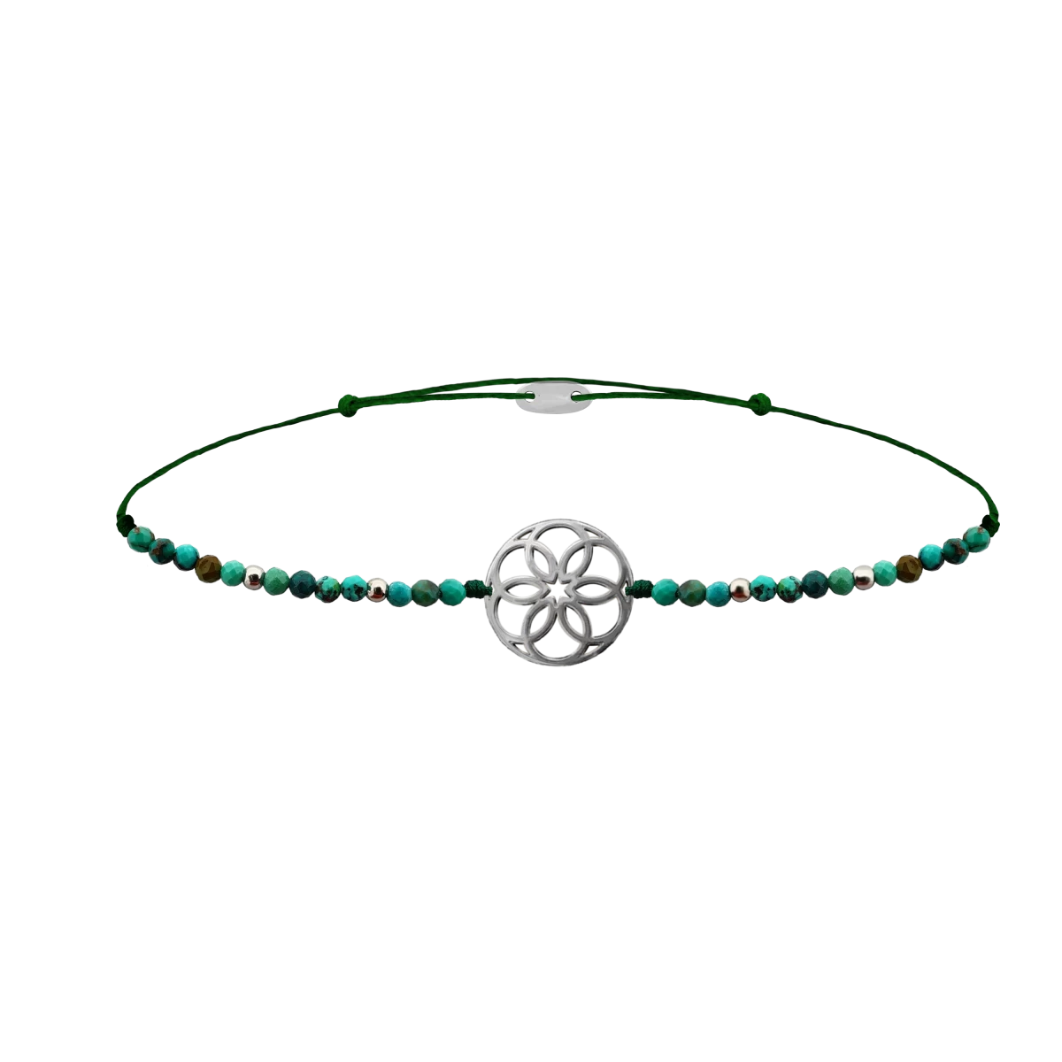 Élvezd a mandala szimbólumának nyugtató hatását és a türkiz ásvány védelmező energiáit ebben a kifinomult karkötőben, amelyet az ezüst golyók fénye tesz igazán különlegessé és ideális kiegészítővé bármely öltözékhez. A medál átmérője 13 mm.