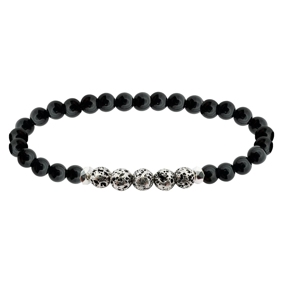 A férfiak számára tervezett, ónix és lávakő ásványokkal, valamint ezüst 925 kiegészítővel ellátott karkötő nem csak a stílusos megjelenést szolgálja, hanem a bátorság és az erő kifejezésére is tökéletes, hiszen ezek az ásványok hagyományosan az erő és a kitartás jelei.