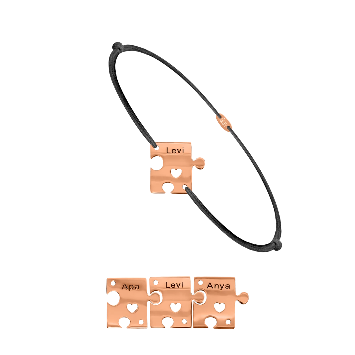 Stílust és érzelmet egyesít ez a különlegesen tervezett puzzle formájú karkötő, ahol mindhárom medál gravírozott üzenete a viselő és szerettei közötti kapcsolatok mély, személyes jelentőségét tükrözik, épp úgy szerelmespárok, barátok és családok számára. A medálokra gravírozandó neveket, a karkötők méretét és a választott fonalszínt a Megjegyzés mezőben jelezd nekünk!