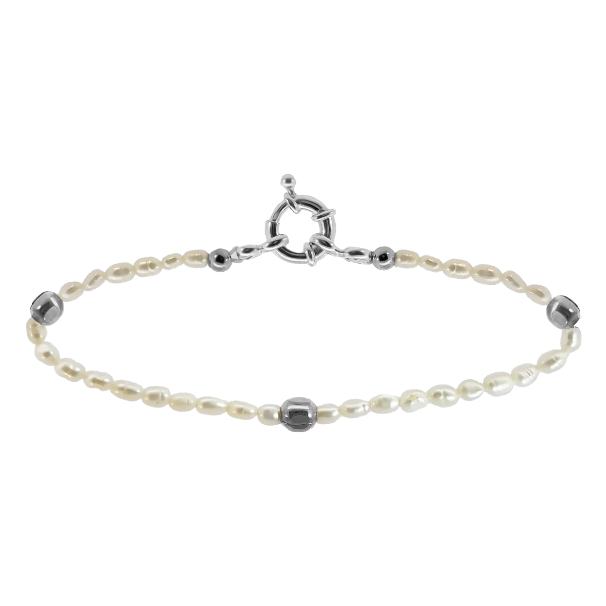 Sajátos eleganciát sugároz ez a rizsszemű fehér édesvízi gyöngyből készült különleges női bokalánc, amely kifinomult stílust és luxust kínál és amelyet tovább fokoz a három prémium minőségű ezüst 925 lekerekített kocka és az impozáns nagy karabiner. Elegáns nyári kiegészítő a gyöngy ékszerek kedvelőinek.