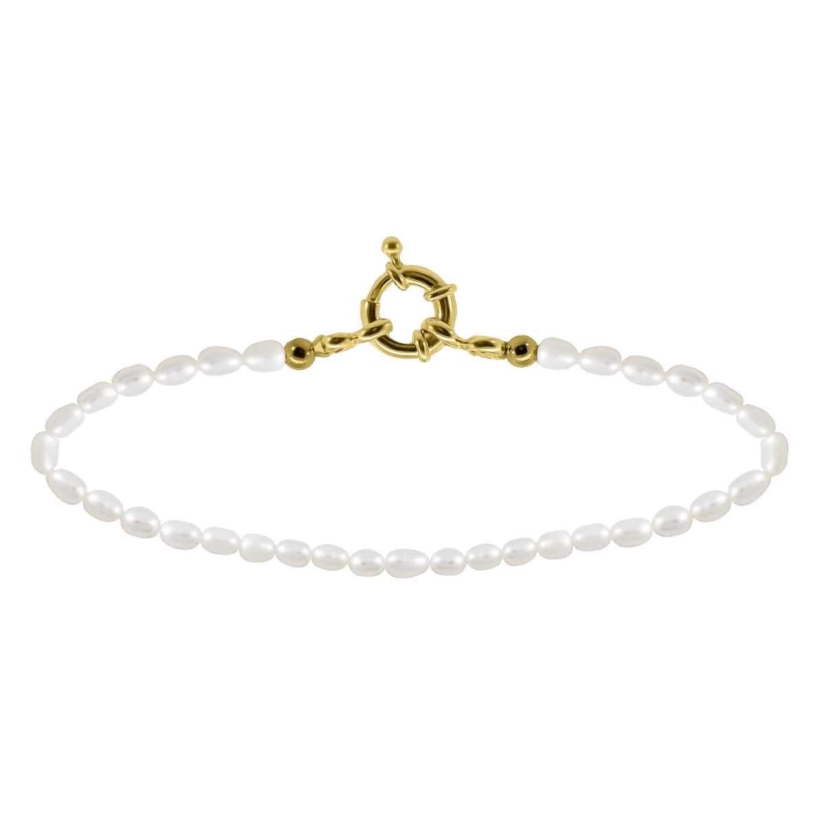 Hölgyek, akik szeretitek az elegáns és látványos kiegészítőket! Imádni fogjátok ezt a nyári bokaláncot, amely rizsszemű fehér édesvízi gyöngyökből készül és amit figyelemfelkeltő nagy – 18 karátos sárgaarannyal bevont ezüst 925 - karabiner tesz még különlegesebbé – tökéletes a vízpartra és bármilyen nyári eseményre.