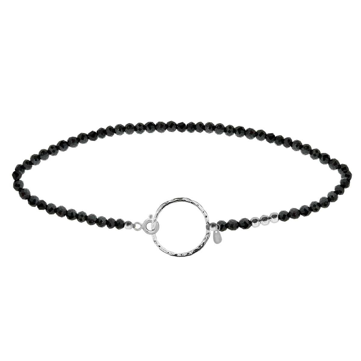 Hagyd, hogy a spinell természetes szépsége és mély, rejtélyes fénye magával ragadjon ebben a különleges karkötőben, amely egy elegáns, vésett felületű kör medált és három fényes ezüst golyót ötvöz, így tökéletes választás azok számára, akik szeretik a finom, mégis erőteljes kiegészítőket.