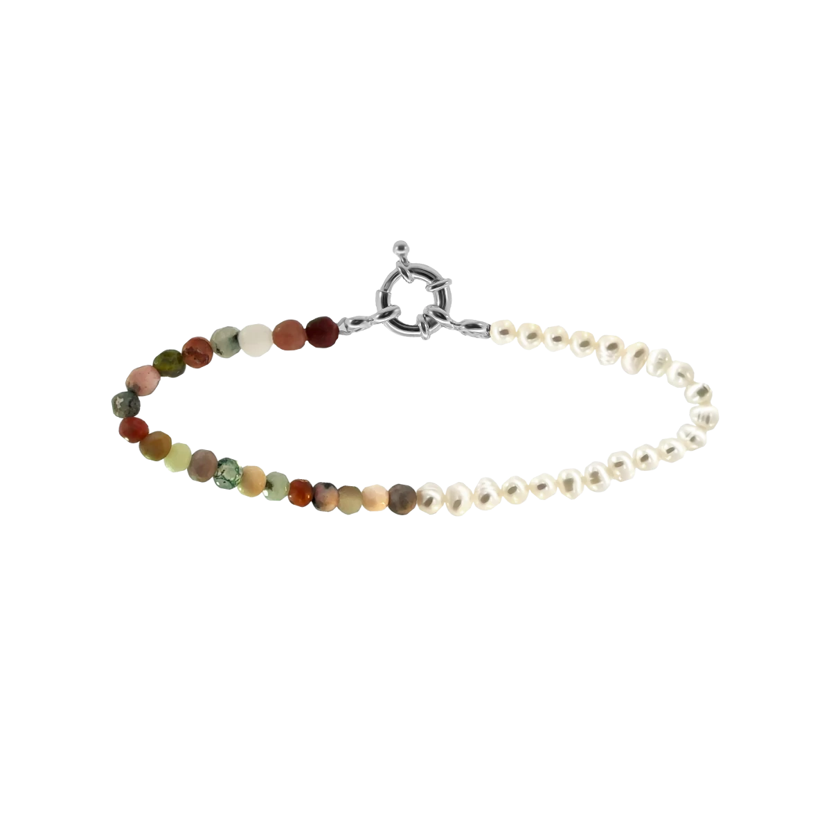 Ezen egyedi tervezésű karkötő megkapó szépségét a gyöngy finomsága és az őszi színekben pompázó ásványok (kalcedon, agate, kvartz, márvány, kalcit) ragyogása adja; az elegáns ezüst karabiner pedig tovább emeli az az ásványok által nyújtott természetes energiát és az egyedi megjelenést.